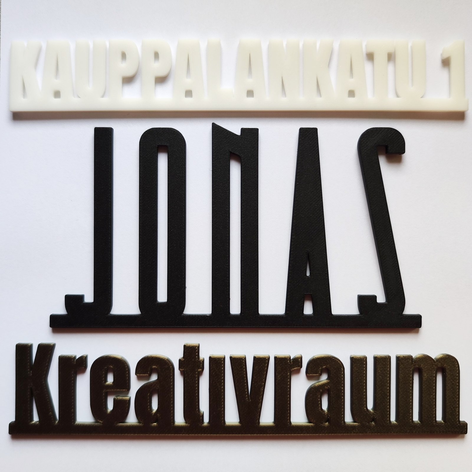 Räätälöidyt 3D-tulostetut ovikyltit kotiin tai toimistoon, klassiset fontit suoralla rivillä – moderniin ilmeeseen. Valmistettu kestävästä ja ympäristöystävällisestä PLA-muovista. Voit valita laajan valikoiman värejä, fontteja ja kokoja, jotka sopivat täydellisesti sisustukseesi ja tilaasi. Nämä kyltit sopivat erinomaisesti toimiston ovien tai vain tilan merkitsemiseen, ja ne tarjoavat modernin ja tyylikkään tavan.