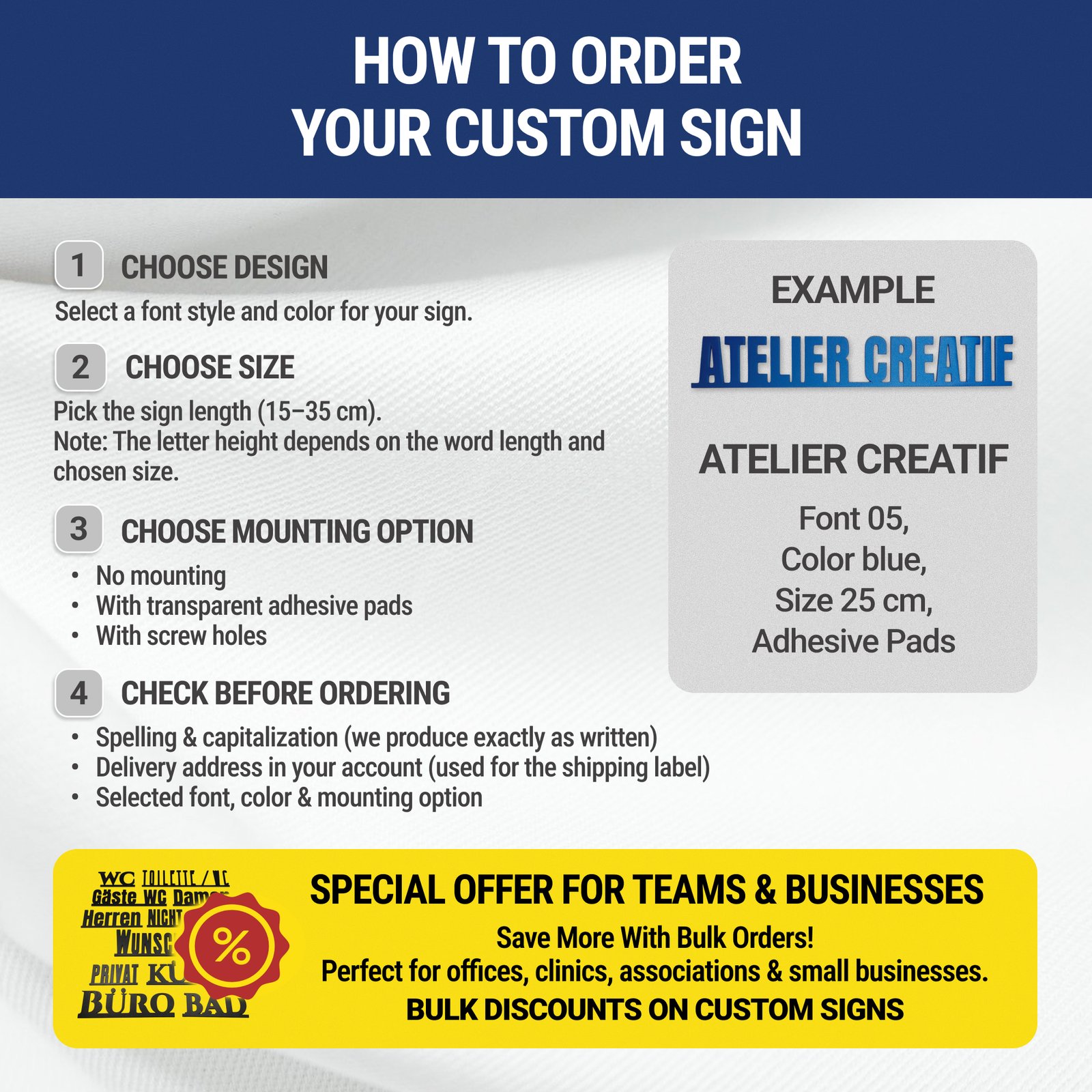Each sign is custom-made in classic lettering and a quality finish that will last. The lightweight PLA material makes installation a breeze, even self-adhesive, and its robust nature means your custom sign will maintain its great look over time.