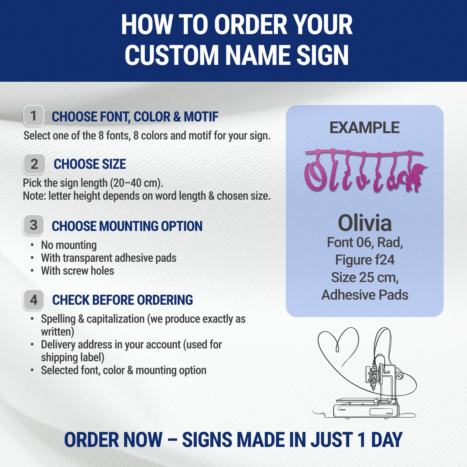 TECHNOLOGY & MATERIAL & SAFETY INSTRUCTIONS Product type: Custom-made sign (intended solely as a decorative or informational sign). Material: PLA (polylactide). PLA is a biodegradable plastic. 3D printing technology. Safety instructions: This sign is for decorative purposes only. Not a toy: It is not a toy and should be kept out of reach of small children and pets to avoid swallowing small parts. Temperature & direct sunlight: Do not expose the sign to direct sunlight or high temperatures (over 60°C/140°F) for extended periods. Disposal: Please dispose of the product at the end of its useful life in accordance with local regulations. Cleaning: Clean with a soft, damp cloth if necessary. Do not use harsh cleaning agents. Welcome to my NameJoki shop featuring custom 3D-printed labels and signs with beautiful and creative lettering.